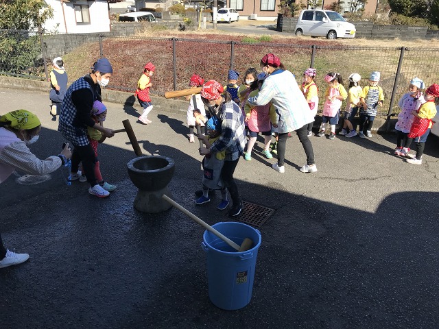 クリスマス会もサンタさんが大きな荷物を持って学舎にやって来ました。目をまんまるくするお友達!きゃぁー!きゃぁー!と喜んではしゃぐお友達!中には恐る恐る後ずさりするお友達!・・・・・最後はプレゼント貰って記念写真!!今年最後の行事!餅つきでした。
