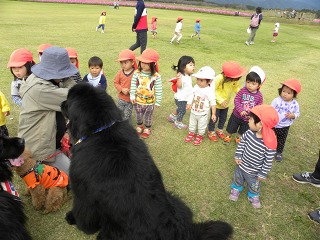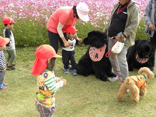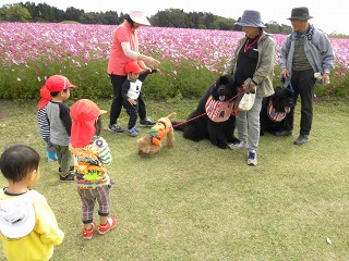 コスモス(秋桜)の花が満開でした。 公園散歩中・・大きな大きな犬(ニュウファンドランド犬)兄弟が散歩中でした。 初めのうちは恐々でしたが、直ぐに手で触るようになりみんな大喜びでした。 大きな手作り凧を揚げていたので、こども達も一緒になって走っていました。
